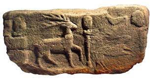 Die kopflose Statuette mit einem Jagdgewand bekleidet zieht einen Pfeil aus dem Köcher und wird von einem Jagdhund mit einem Hasen im Maul begleitet. | Relief der Göttin ABNOBA an der Brigachquelle im Schwarzwald. Zu sehen auch ein Hirsch, ein Hase und ein Vogel zwischen 2 Menschenköpfen |